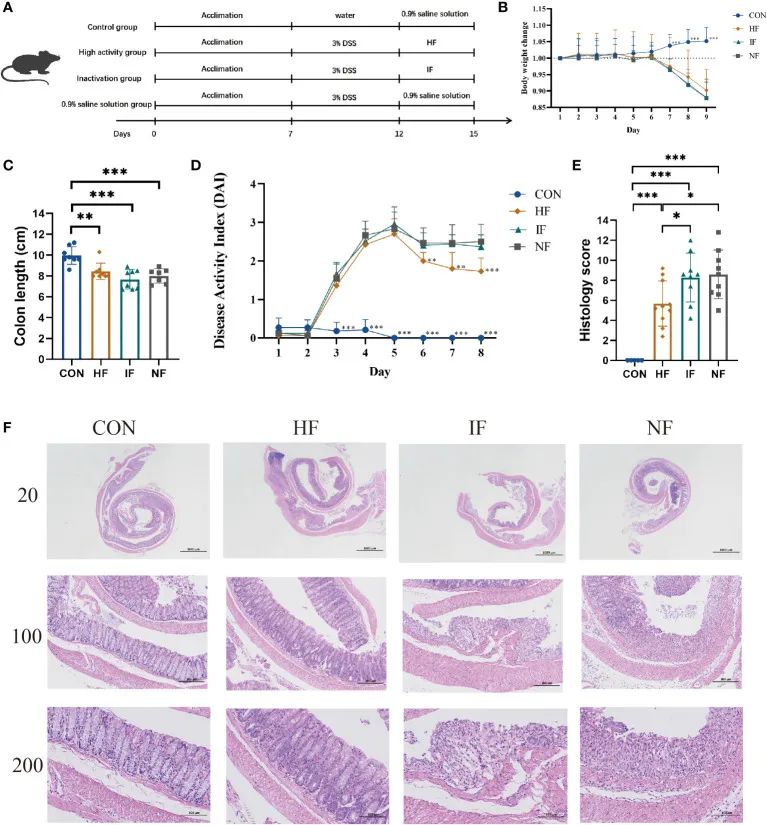為了研究FMT中活菌對(duì)結(jié)腸炎的緩解作用。我們通過(guò)給30只小鼠水中添加3%DSS,自由飲水連續(xù)5天,誘導(dǎo)潰瘍性結(jié)腸炎小鼠模型。然后在第6天開(kāi)始對(duì)小鼠進(jìn)行FMT干預(yù),連續(xù)3天(圖1A)。對(duì)照組(CON)的小鼠(n=10)精神狀態(tài)良好,沒(méi)有腹瀉和軟便。DSS小鼠從造模第3天開(kāi)始出現(xiàn)稀便,隨后出現(xiàn)嚴(yán)重的軟便、血便。DSS誘導(dǎo)的小鼠被平均分為三組,分別進(jìn)行FMT的高活性糞便、滅活糞便和生理鹽水治療。從圖1B中,我們可以看到前4天HF組(高活性糞便組)、IF組(滅活糞便組)和NF組(生理鹽水組)之間沒(méi)有明顯的差異,所有小鼠體重均呈下降趨勢(shì)。IF結(jié)腸長(zhǎng)度與CON組相比,結(jié)腸長(zhǎng)度明顯減少,而HF組、IF組和NF組之間沒(méi)有明顯的差異(圖1C)。DSS誘導(dǎo)的小鼠的DAI評(píng)分在第3天增加,其中HF組的小鼠在第3天的DAI評(píng)分明顯高于CON組,HF組的小鼠的DAI評(píng)分明顯低于NF組(圖1D)。在組織學(xué)評(píng)分方面,HF組的評(píng)分明顯低于IF和NF組,而IF組和NF組之間沒(méi)有顯著差異(圖1E)。同時(shí),組織學(xué)分析進(jìn)一步揭示了觀察到的結(jié)腸標(biāo)本的組織病理學(xué)狀況如圖1F所示,CON組和HF組的結(jié)腸組織形態(tài)正常, 組織結(jié)構(gòu)層次分明,粘膜層、粘膜下層和肌肉層清晰可見(jiàn),隱窩和杯狀細(xì)胞良好,排列整齊。而IF組和NF組看到不同數(shù)量的炎癥細(xì)胞,潰瘍病灶附近的隱窩擴(kuò)張。總之,這些結(jié)果表明,F(xiàn)MT中的活菌能夠參與并改善臨床上的結(jié)腸炎癥狀況和結(jié)腸損傷,而死菌則不能。