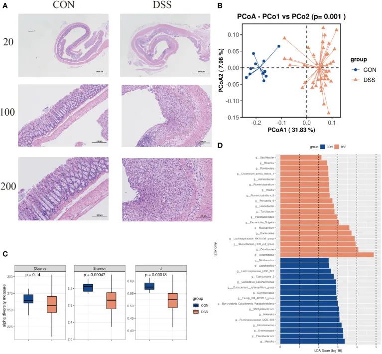 組織學(xué)分析顯示,與正常小鼠相比,DSS誘導(dǎo)的小鼠在結(jié)腸粘膜層形成潰瘍病灶,壞死擴(kuò)散到整個(gè)粘膜,導(dǎo)致固有層脫落和結(jié)締組織增生,其間有不同數(shù)量的炎癥細(xì)胞浸潤(rùn),潰瘍病灶附近的隱窩擴(kuò)張(圖3A)。另一方面,與CON組相比,UC小鼠糞便活細(xì)菌的α多樣性指數(shù)Observe、Shannon和J明顯下降(P<0.05,圖3C)。通過(guò)PCoA圖清楚地觀察到結(jié)腸炎小鼠和正常小鼠之間的活的細(xì)菌群落的聚類(lèi)有顯著差異(P<0.05,圖3B)。此外,DSS誘導(dǎo)的結(jié)腸炎小鼠的活細(xì)菌組成在屬的水平上與對(duì)照組存在明顯不同。與CON組相比,包括Massilia、Rikenella、Butyricoccus和Enterococcus在內(nèi)的16個(gè)屬中減少,而包括Akkermansia、Blautia和Odoribacter在內(nèi)的19個(gè)屬在DSS組顯著增加(P<0.05,圖3D)。這些結(jié)果表明,DSS誘導(dǎo)后顯著改變了小鼠的腸道中活的細(xì)菌群落和結(jié)腸黏膜結(jié)構(gòu)。