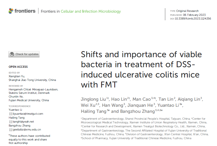 近日,承葛生物聯(lián)合山西省人民醫(yī)院、廈門(mén)聯(lián)合呼吸健康研究院、西安市中心醫(yī)院、福建中醫(yī)藥大學(xué)等三甲醫(yī)院與高校在腸道微生態(tài)領(lǐng)域頂級(jí)期刊《Frontiers in Cellular and Infection Microbiology》(IF: 6.073, JCR: Q1)發(fā)表活菌分析的研究性論文。文章以潰瘍性結(jié)腸炎(UC)為例,開(kāi)創(chuàng)性的結(jié)合PMA和16s rRNA基因測(cè)序技術(shù),建立了菌群中活菌數(shù)量與組成結(jié)構(gòu)的分析方法 (已獲授權(quán)發(fā)明專(zhuān)利,點(diǎn)擊查看);進(jìn)一步通過(guò)菌群移植實(shí)驗(yàn)表明,只有移植活的腸道菌群才能顯著改善UC小鼠的表型、組織病理與腸道菌群結(jié)構(gòu),揭示了高活性菌群在菌群移植中的重要性!文章還深入分析了UC小鼠失衡的活菌特征、以及與菌群移植治療帶來(lái)的小鼠癥狀改善密切相關(guān)的活菌種類(lèi)等,為揭示腸道微生物及菌群移植與UC的發(fā)生發(fā)展和治療之間的重要關(guān)系提供了新視角和新證據(jù)。
