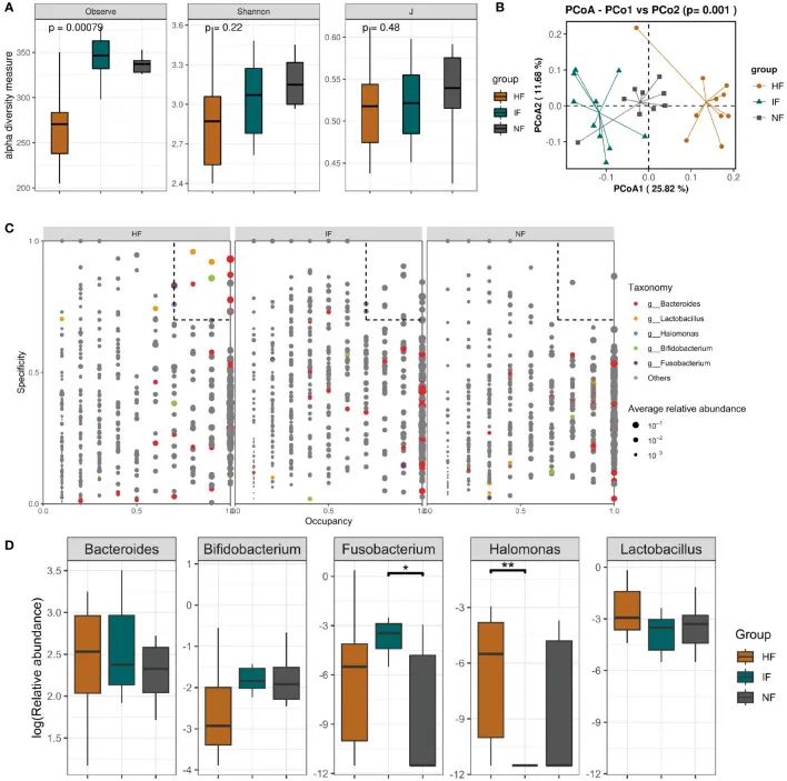 通過(guò)16S rRNA基因高通量測(cè)序分析了HF、NF和IF組的腸道微生物群的變化。HF組的豐富度指數(shù)顯著低于IF和NF組,但Shannon和J指數(shù)沒(méi)有明顯差異(圖4A);PCoA圖分析顯示,治療后三組的活的細(xì)菌群落結(jié)構(gòu)存在著顯著差異(P<0.05,圖4B)。利用SPEC-OCCU對(duì)HF、IF和NF組的微生物群進(jìn)行特異性和占有率(≥0.7)分析(圖4C),共鑒定到與HF組密切相關(guān)的五個(gè)特定的屬,即Bacteroides、Lactobacillus、Halomonas、Bifidobacterium和Fusobacterium。Fusobacterium的相對(duì)豐度在IF組顯著高于NF組(P<0.05),而HF組與其他兩組沒(méi)有明顯差異。然而,HF組的Halomonas和Lactobacillus的相對(duì)豐度明顯高于IF組(圖4D)。在FMT前和后對(duì)比分析中,也觀察到Bacteroides、Lactobacillus、Halomonas、Bifidobacterium和Fusobacterium的相類(lèi)似的變化趨勢(shì)。本次研究鑒定出多個(gè)發(fā)生顯著改變的活細(xì)菌屬,他們對(duì)UC的癥狀的改善可能起著核心作用,這可能對(duì)UC的診斷和治療具有潛在的意義,值得進(jìn)一步深入探索。